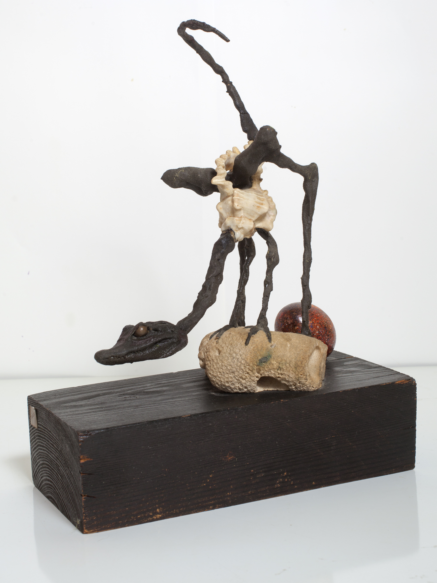 Material: La base es una caja de madera. En su interior hay varios huevos hechos uno a uno en marmolina. De uno de ellos está ha surgido un extraño ser. Centro de la caja hay una foto de un nido vacío.